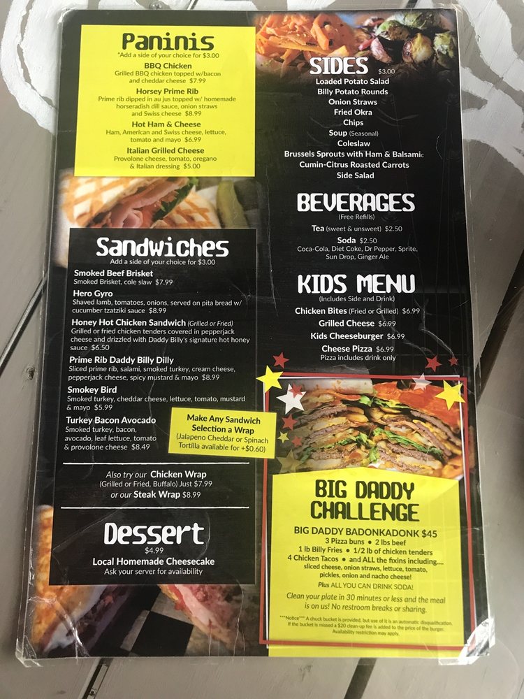Daddy Billy's, a lively American bar in Tullahoma, TN, offers a diverse menu with a focus on BBQ Chicken, Grilled Cheese, Horsey Prime Rib, Hot Ham & Cheese, and Italian Grilled Cheese. The food is paired with classic sides like Beer Battered Fries, Billy Fries, and Fried Okra. What sets Daddy Billy's apart is its Big Daddy Challenge, featuring the massive Badonkadonk sandwich. The atmosphere is casual and divey, perfect for groups and families, with outdoor seating and live music. The restaurant also offers takeout, delivery, and catering services, making it a convenient option for any occasion. Don't miss out on their local homemade cheesecake for a satisfying end to your meal. Daddy Billy's is definitely a must-try spot for tasty American fare in a fun setting.
